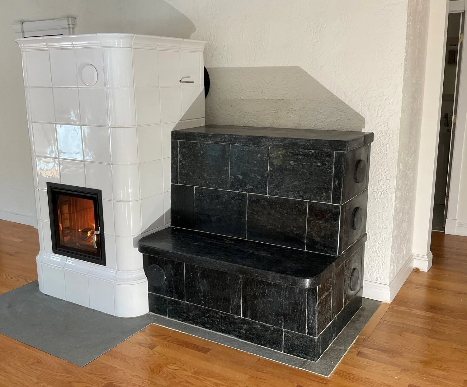 Although a Masonry Heater can look very much like a traditional fireplace, they have many unique features that allow them to have exceptional design flexibility. Heated Hearths and Back Rests; the use of stone, tile, stucco, or brick can make a masonry heater functional like furniture and beautiful like artwork.