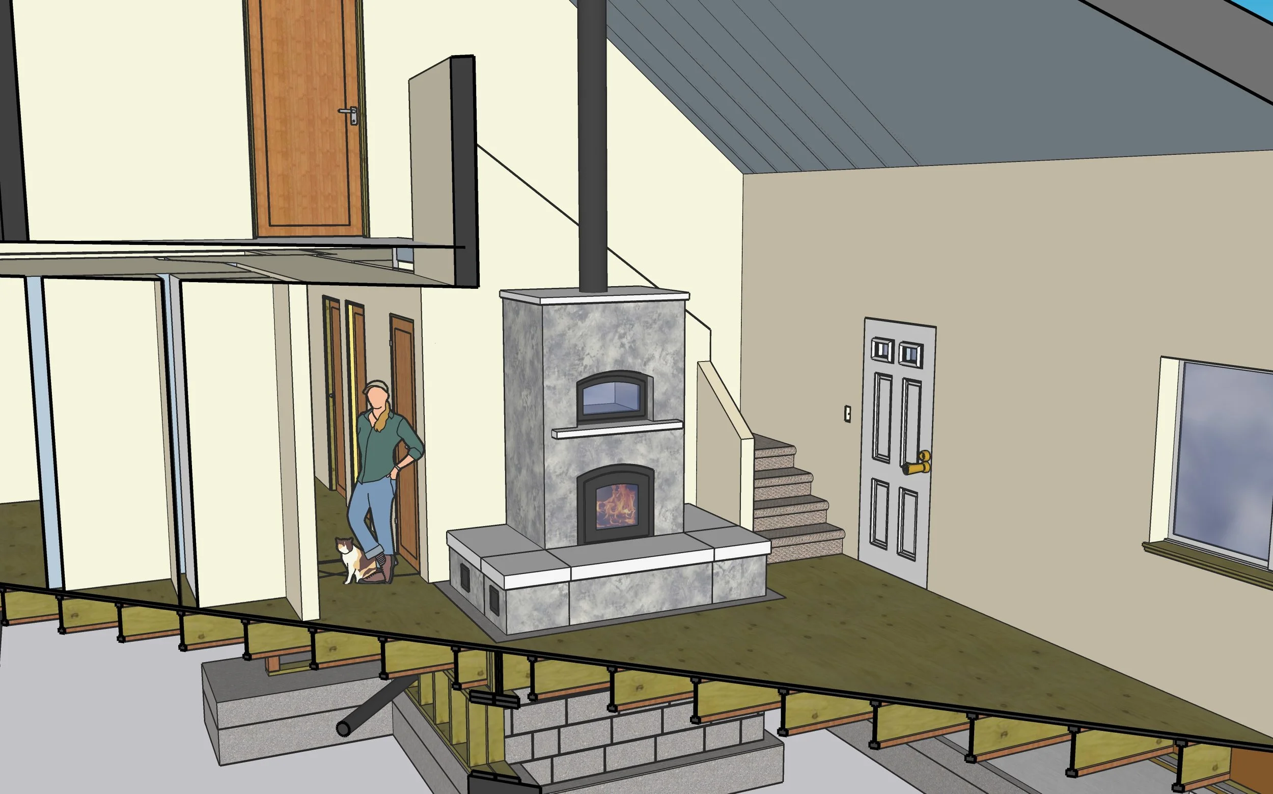 Foundations will come in various shapes and sizes and will need to be designed to accommodate the design of the masonry heater. This common shape for a masonry heater also shows a common foundation style. Some ideas for foundations going into a finished basement include utilizing the space for a closet with one open face for the door. An ash pit is common as well and allows for minimal cleaning during the heating season. In the case where the heater will be over a hallway, a foundation can be designed where two masonry walls of a hallway are capped with the masonry heater pad, creating a foundation “tunnel”. The point of these few ideas is to show that there are many ways to “conceal” a foundation in a finished basement.