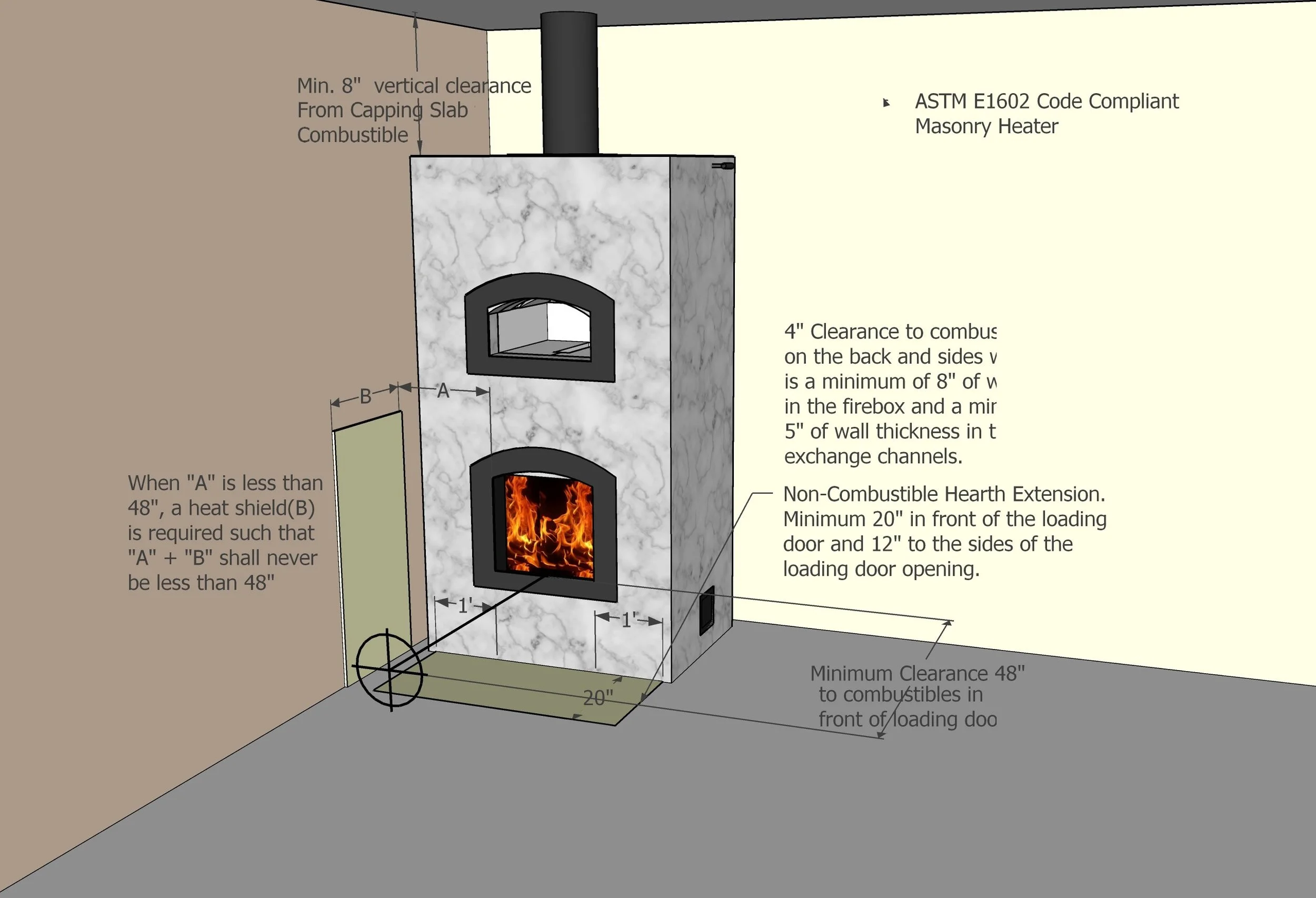 a. Masonry Heaters that meet this wall thickness exemption enjoy a 4” clearance to combustibles on the sides and back, and 8” from the capping slabs to the closest overhead combustible. They still have a 48” clearance to combustibles from in front of the loading door. Please see the clearance diagram below.